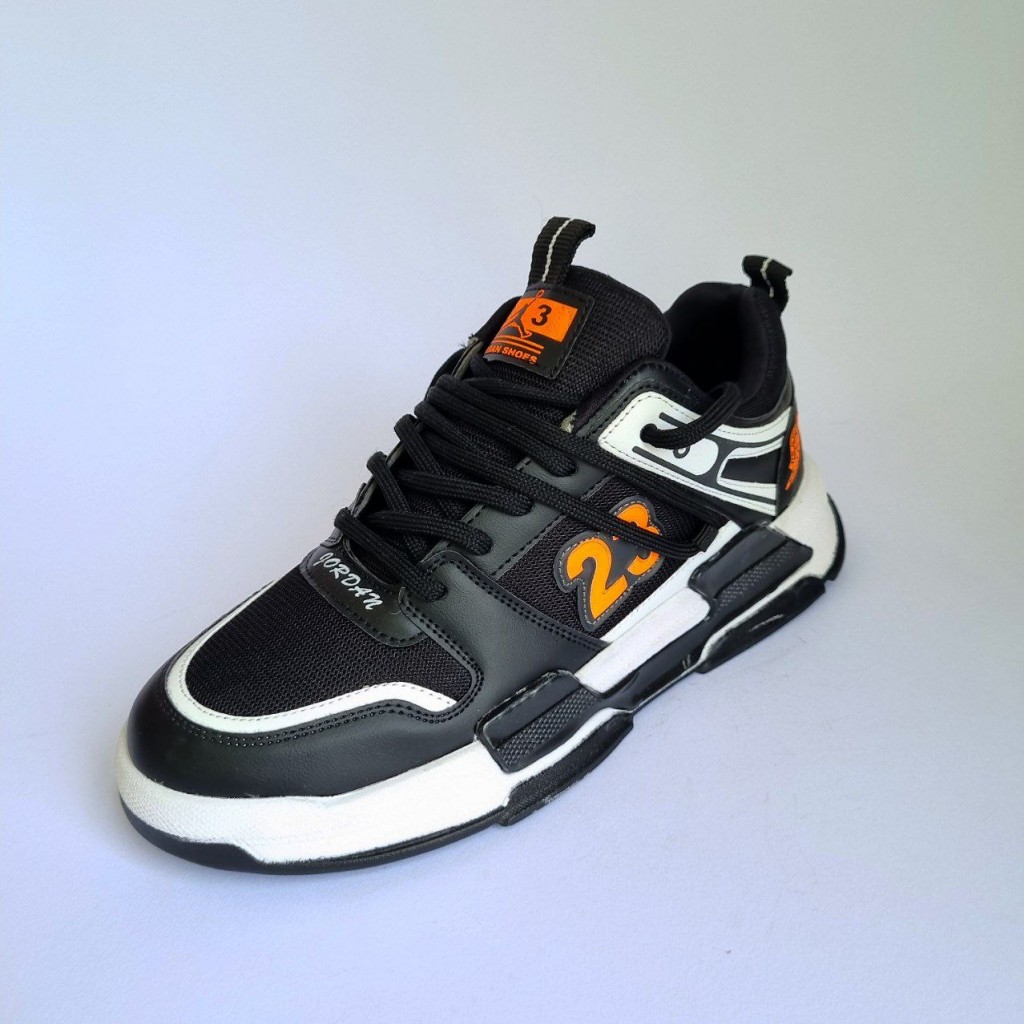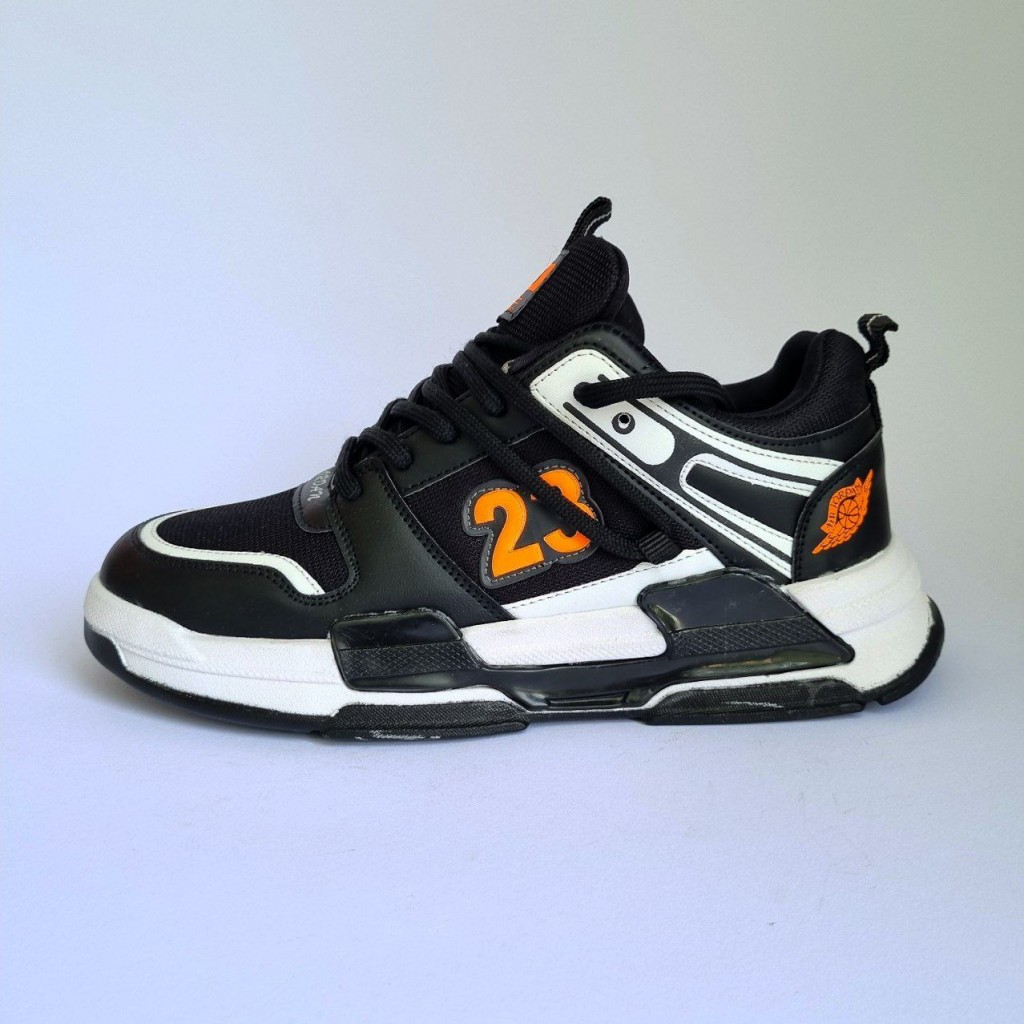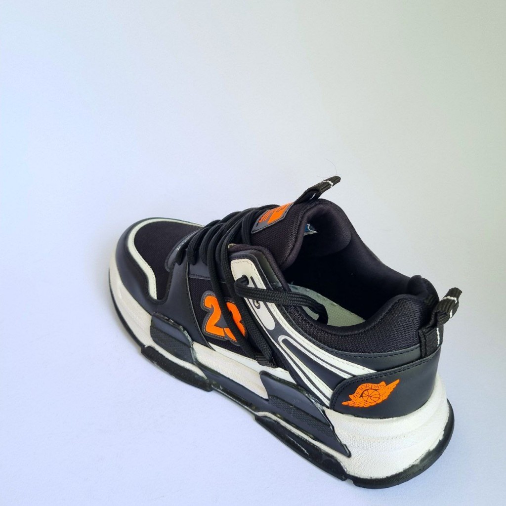 حراج عالی کفش اسپرت مردانه و پسرانه مدل جردن 23 زیبا و راحت رنگ مشکی سفید نارنجی شیک