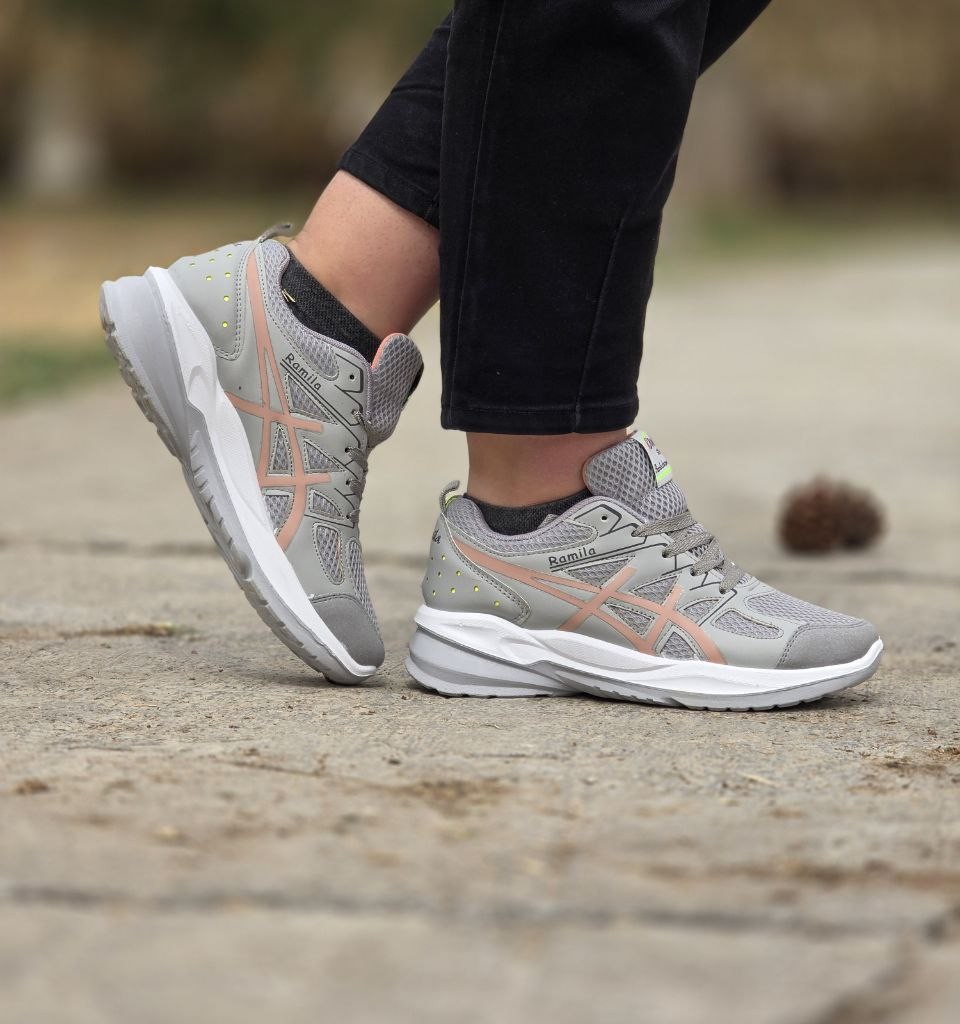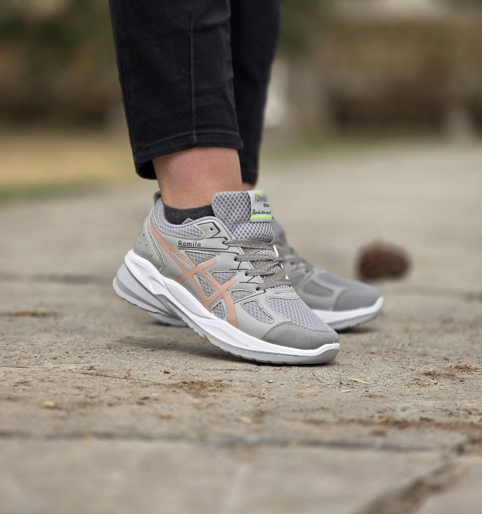 فروش بی نظیر کفش کتونی اسپرت دخترانه زنانه مدل جدیدرامیلا آسیکس سبک و مقاوم رنگ طوسی کرم باارسال رایگان